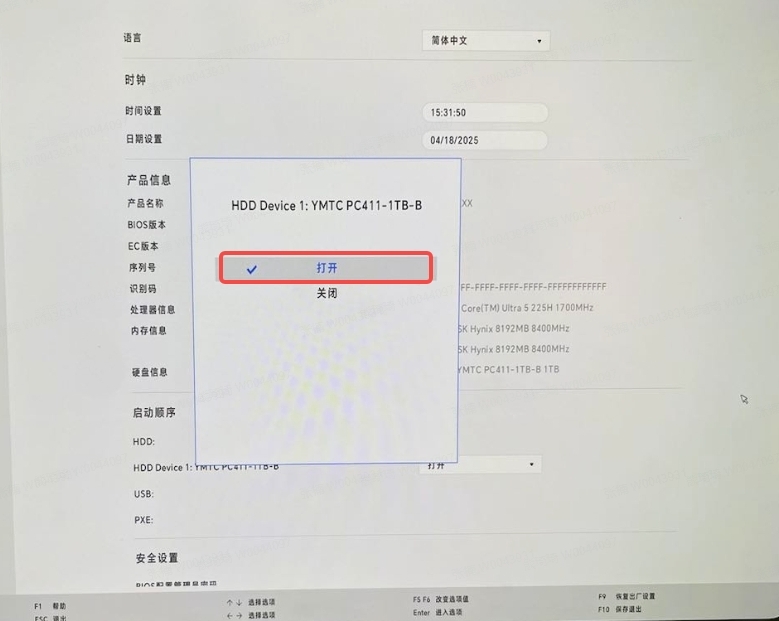 - 在启动顺序下,选择硬盘信息,将硬盘启动顺序设置为打开状态。