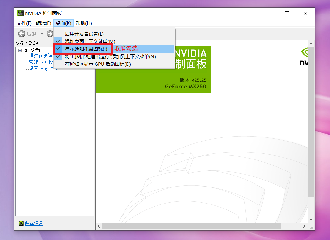 您也可以通过如下操作隐藏NVIDIA独立显卡通知托盘图标: