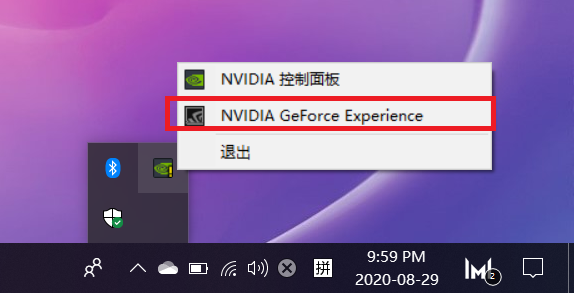 在NVIDIA通知托盘图标处右键选择NVIDIA GeForce Experience。