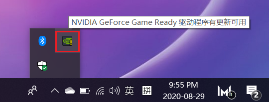 计算机的任务栏中,NVIDIA独立显卡的通知托盘图标上有黄色感叹号显示,并提示NVIDIA GeForce Game Ready 驱动程序有更新可用。