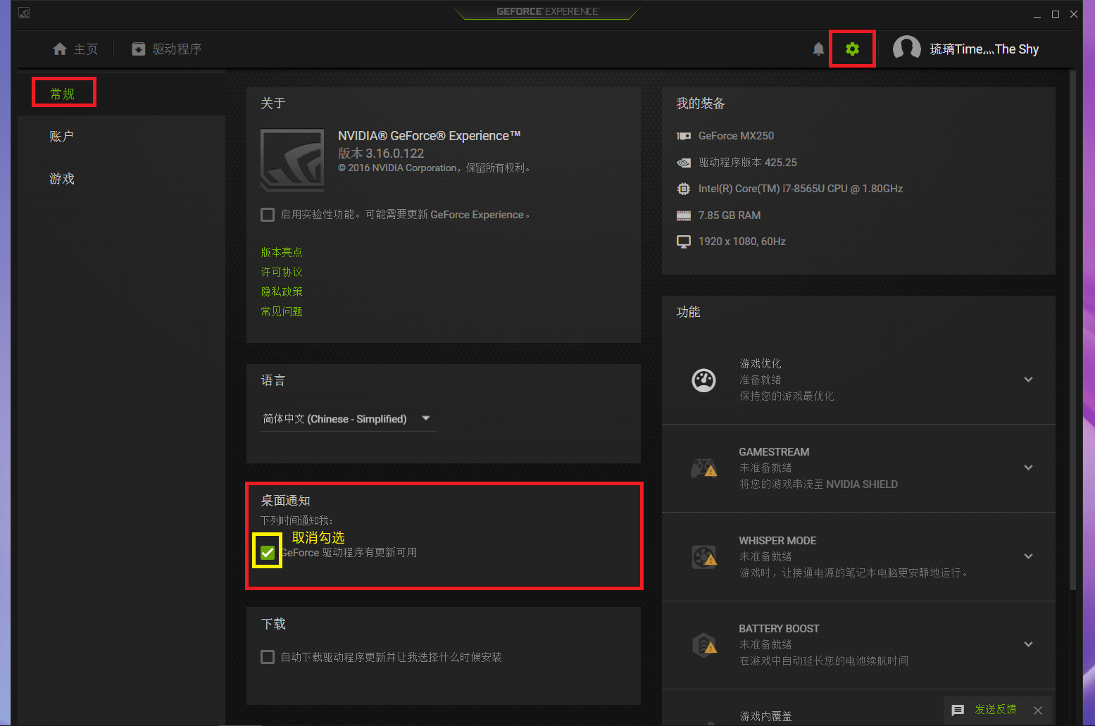 点击GeForce Experience页面的设置按钮,在常规选项卡页面,取消勾选桌面通知下的GeForce驱动程序有更新可用项,重启计算机即可。