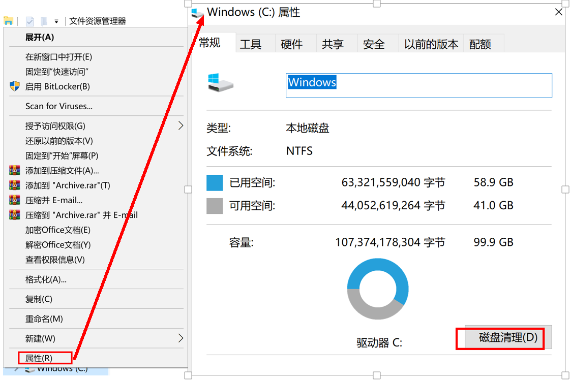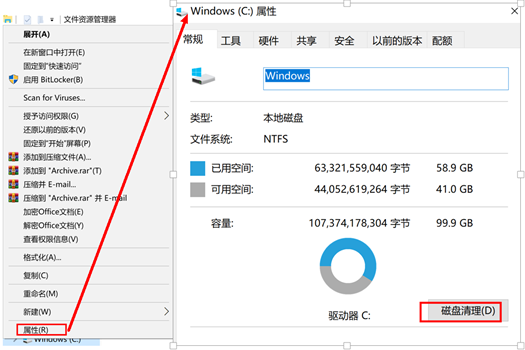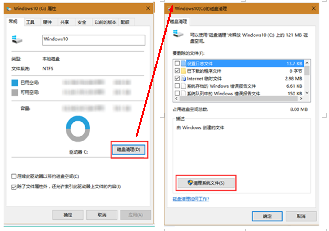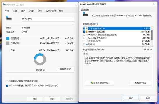 同时按下“Win+E”组合键,打开文件资源管理器,右键点击“Windows(C:)”,选择属性。在弹出的窗口中点击磁盘清理 > 清理系统文件, 此时,系统会进行以前的Windows安装文件扫描。