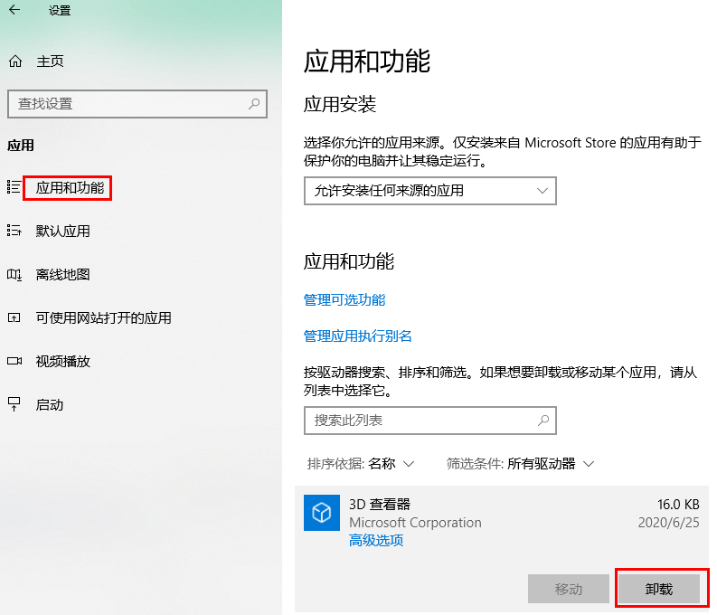 - 在应用功能窗口中,选择应用和功能,在接下来的窗口中,右侧选中不常用的应用后,点击其右下角的卸载按钮。