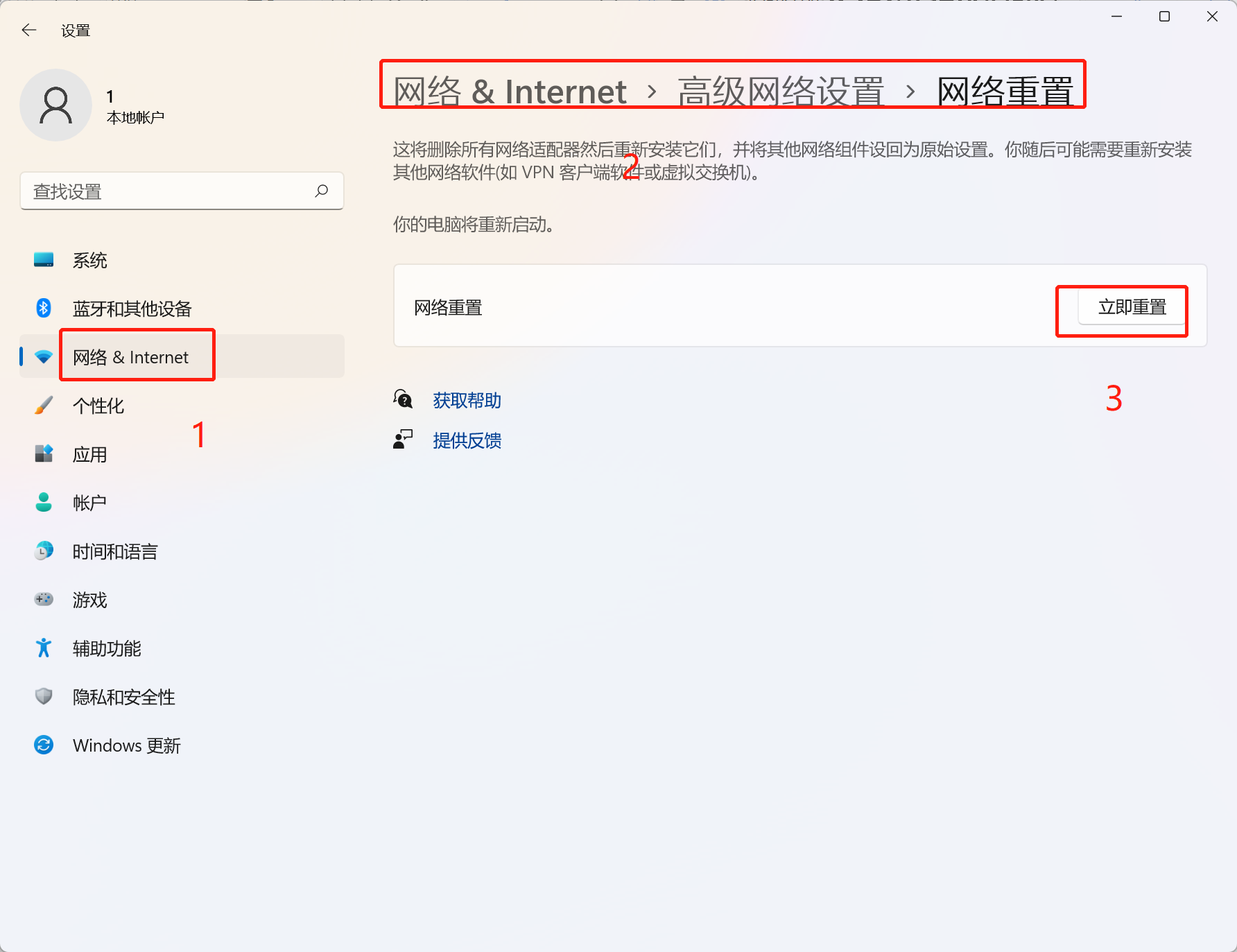 点击任务栏中的网络图标,选择属性>网络&Internet > 高级网络设置>网络重置 > 立即重置。