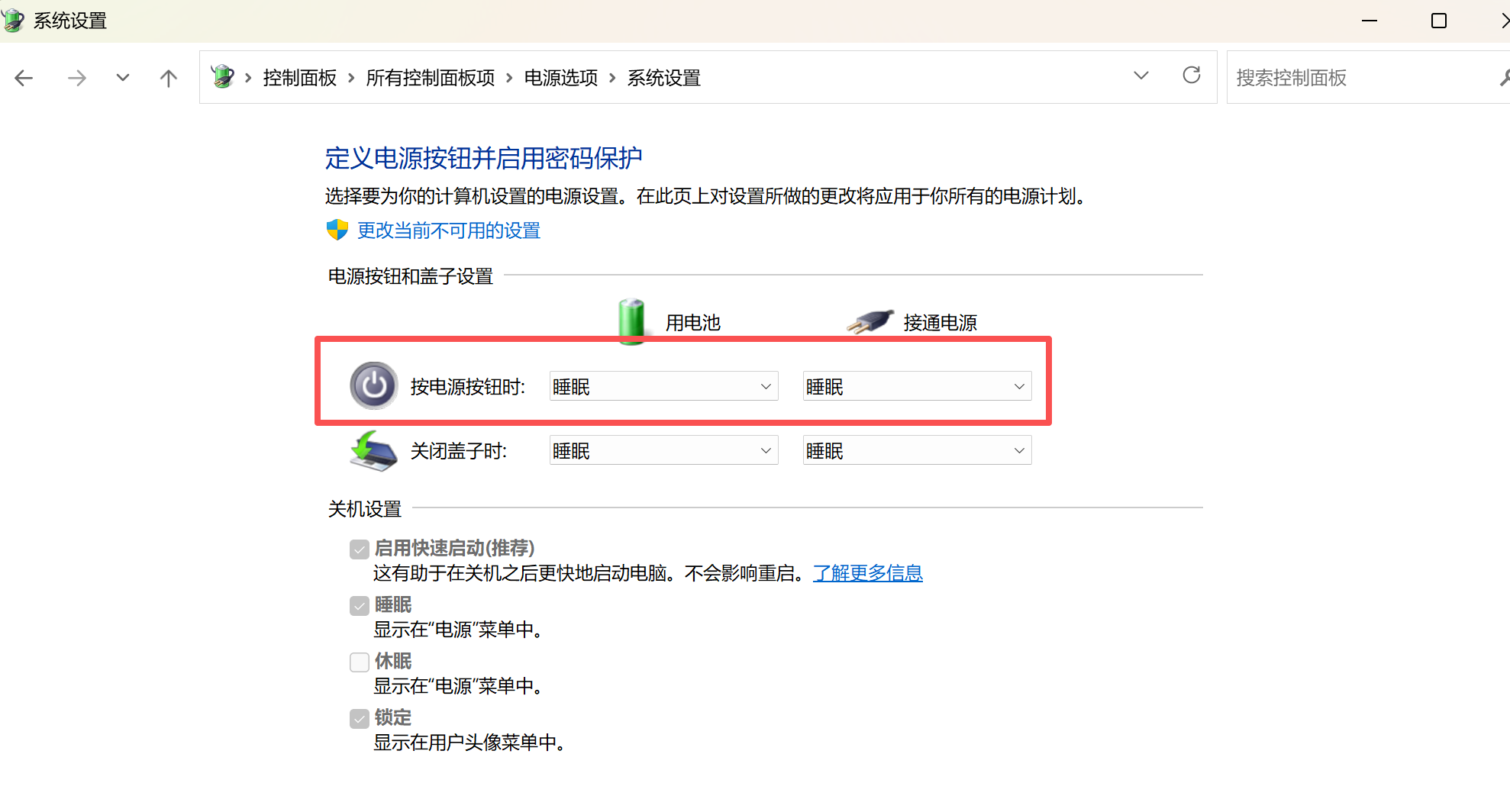 系统中的选项可能被修改了系统默认设置,按电源按钮时,系统不采取任何操作。此时按电源键是无法让笔记本屏幕亮起的。如果需要按电源键时,系统进入睡眠。