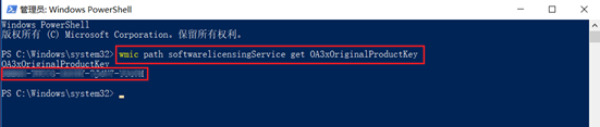 在管理员窗口中输入wmic path SoftwareLicensingService get OA3xOriginalProductKey,按 Enter 键。然后就可以在看到格式为XXXXX-XXXXX-XXXXX-XXXXX-XXXXX的产品密钥。