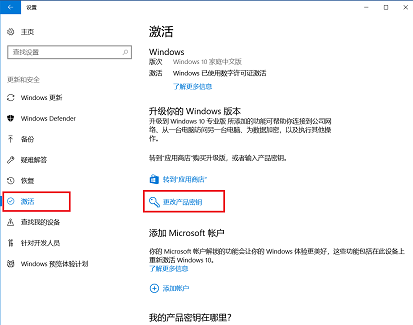 点击 Windows 图标设置>更新和安全>激活>更改产品密钥,在输入框中输入之前在管理员窗口中看到的产品密钥,然后点击下一步,按提示操作即可完成激活。