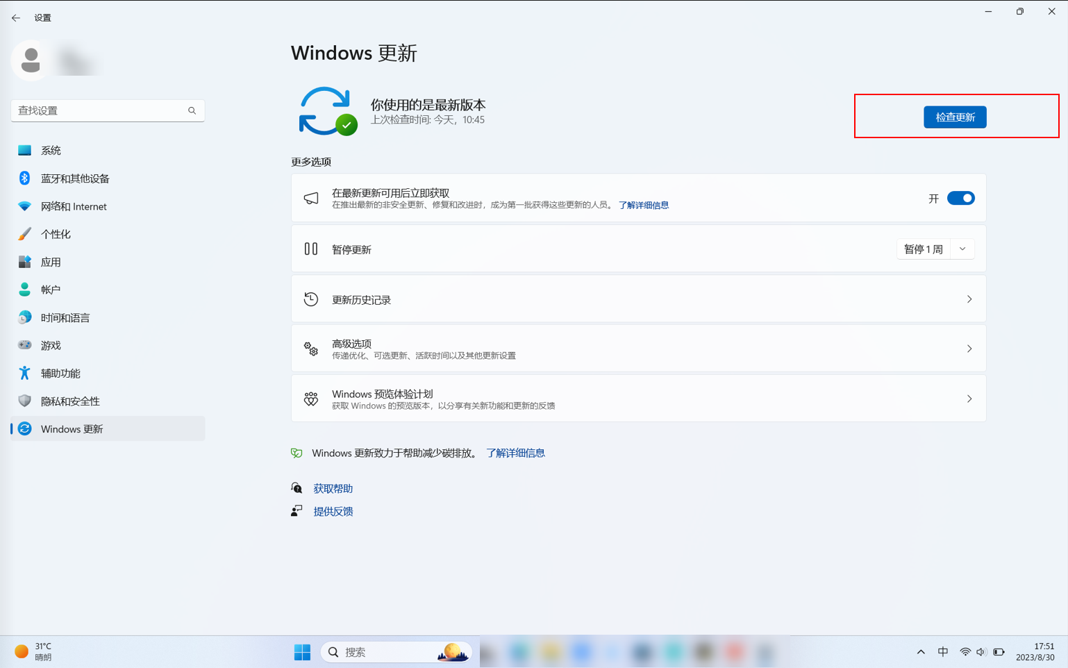 Windows11更新方法:依次点击Windows键>设置 >Windows更新,在Windows更新选项中点击检查更新。