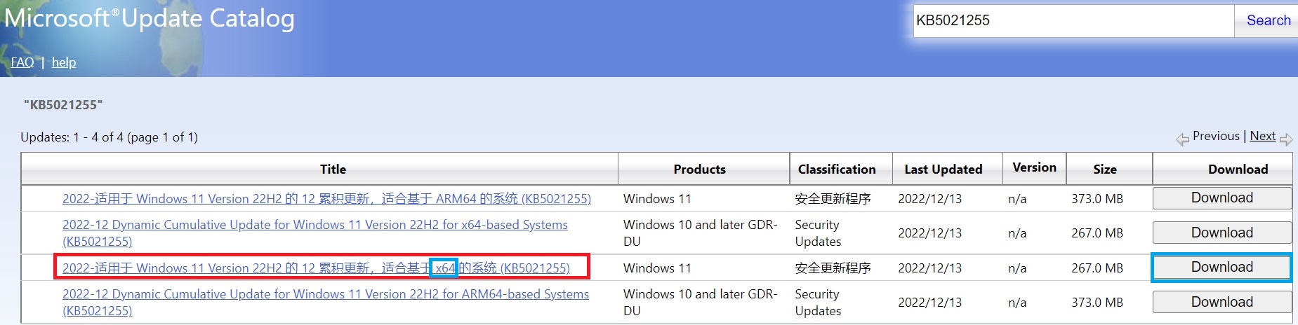 - 进入网站之后,选择 KB5021255 补丁;