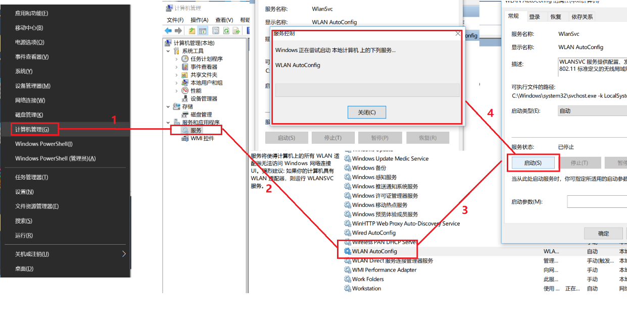 - 右击桌面Windows图标,依次选择计算机管理>服务和应用程序>服务>WLAN AutoConfig,查看 WLAN AutoConfig 服务是否正在运行。