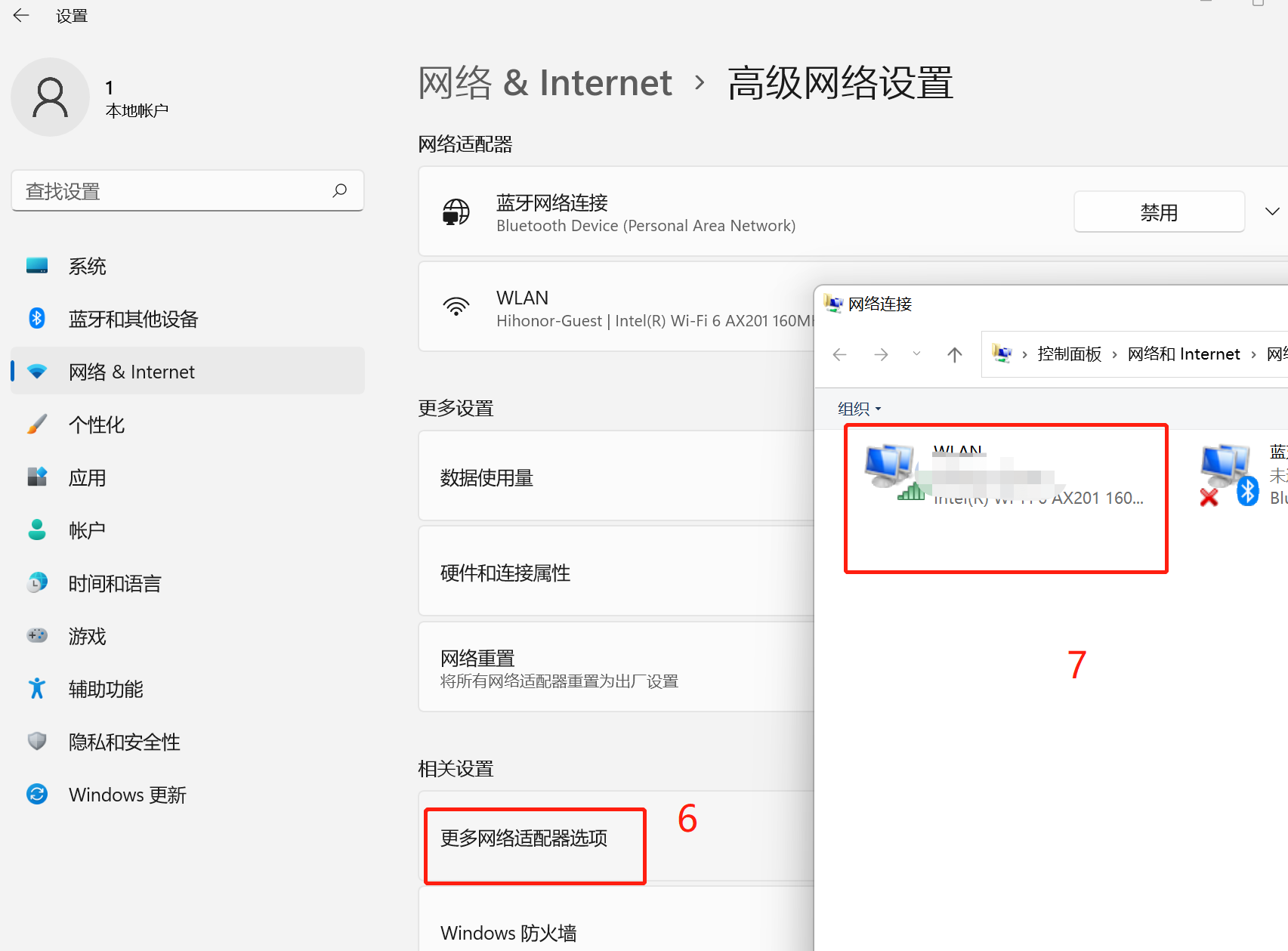 单击WLAN图标,点击“i”,选择网络&Internet设置>高级网络设置>更多网络适配器选项, 右键WLAN图标禁用然后再启用即可。