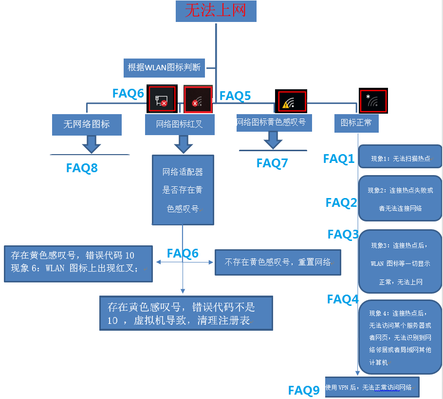 计算机连接WLAN无法正常上网有多重原因,因为WLAN容易受到环境干扰会导致各种问题影响用户体验,计算机无法正常上网需要排查计算机、无线路由器、环境等因素,根据问题现象:无法扫描热点,无法连接热点或者连接热点失败、连接热点成功后图标显示黄色感叹号,连接正常无法识别网络邻居或者局域网其他计算机,WLAN图标显示红叉或者星号,无网络图标,是否使用VPN等问题现象进行判断问题原因。