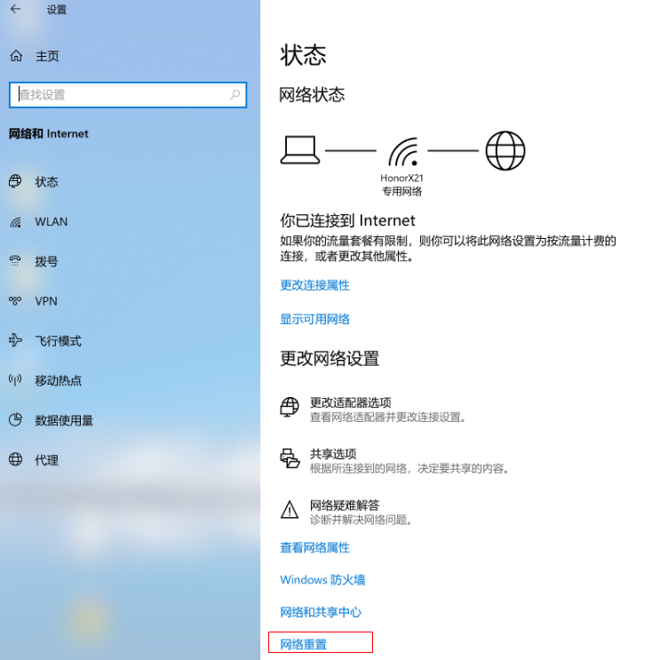 - 如果其他设备和计算机都无法上网,请重启路由器后尝试,如重启无效,请联系网络运营商解决。您也可以单击WLAN图标选择网络和Internet设置>网络和共享中心>更改适配器设置, 右键WLAN图标选择诊断,可以诊断出问题,按照提示操作即可。