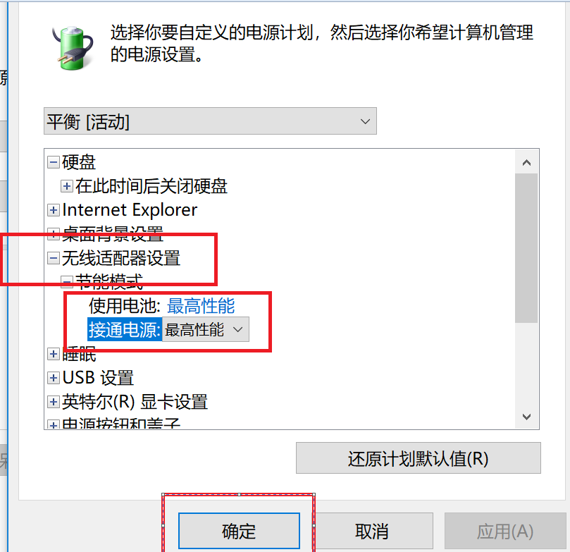 - 无线适配器设置选择节能模式,将使用电池及接通电源都改成最高性能。