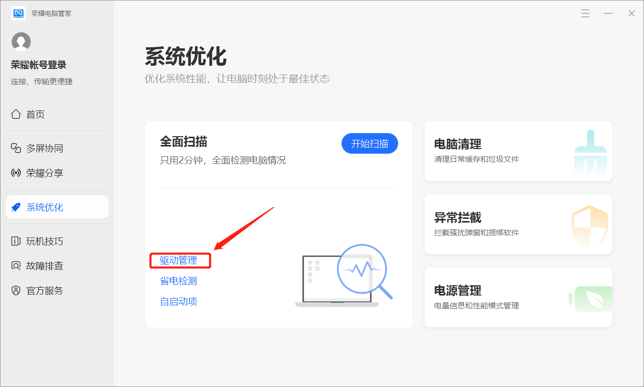 重启后通过有线/无线连接网络,打开荣耀电脑管家,点击“系统优化”,选择“驱动管理”。在驱动管理页面,点击“检查更新”,选择WLAN驱动进行立即更新升级到最新版本,升级完成后重启计算机即可。