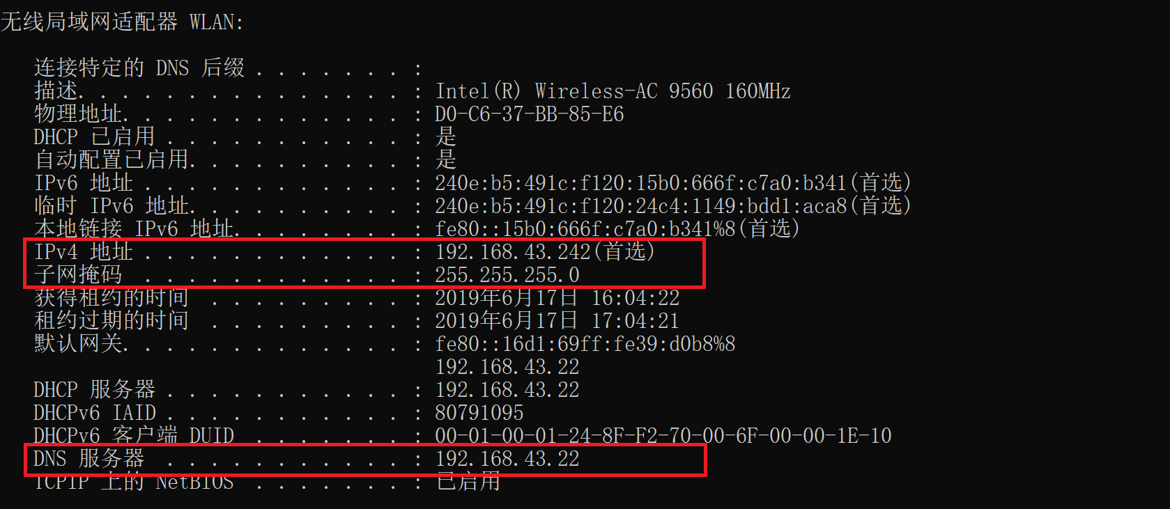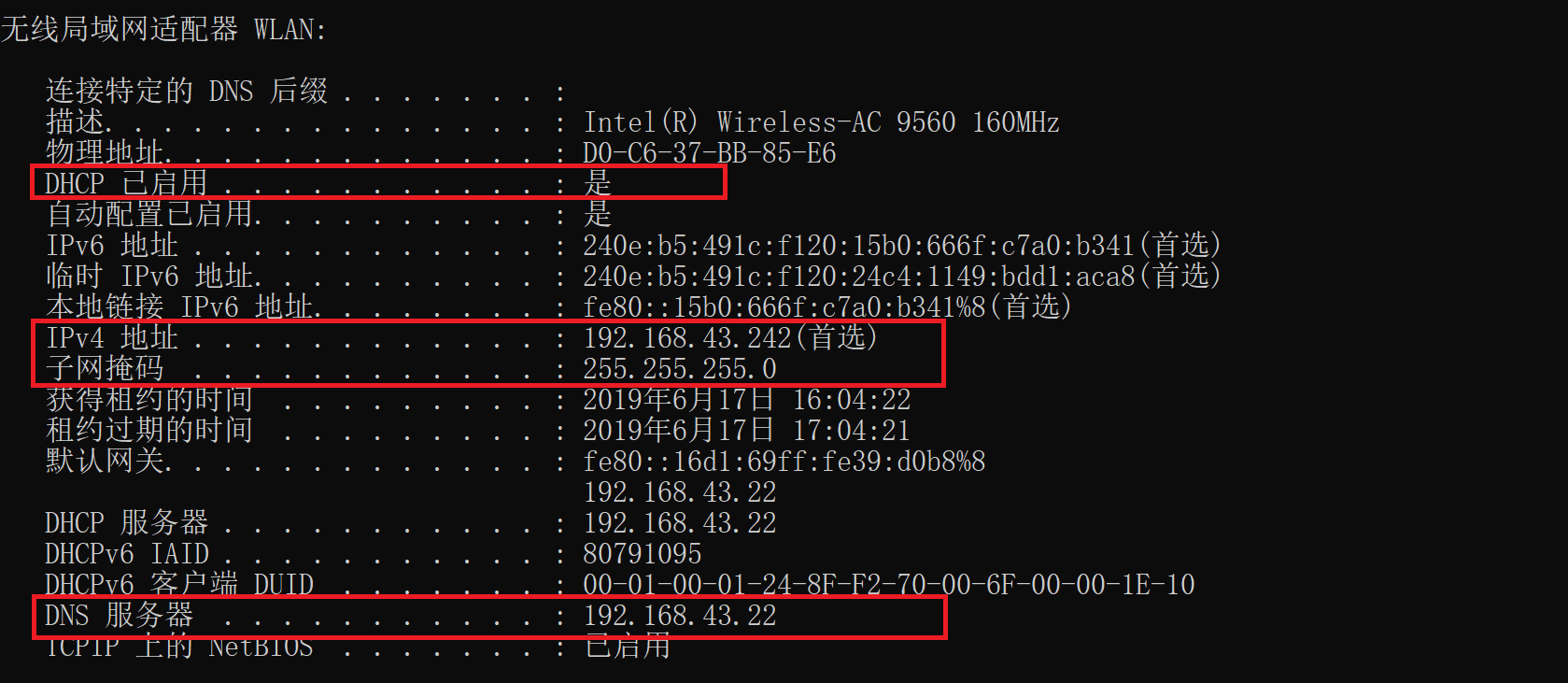 - DHCP如果为是,看一下IP地址和DNS是否存在,如果不存在可以断开连接重新连接或者禁用启用WLAN重新获取IP地址,如果还是不存在请重启路由器即可。