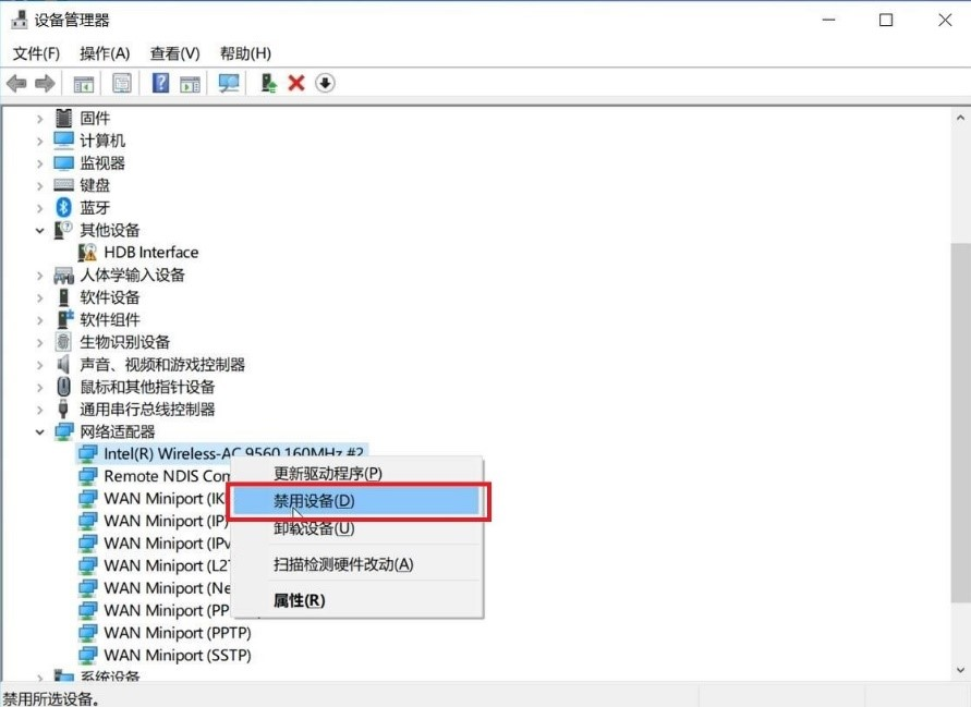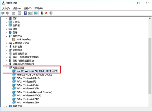 右键点击电脑左下角的Windows图标,选择设备管理器>网络适配器>Intel Wireless-AC 9560选项>选中右键—禁用设备>选中右键—启用设备。