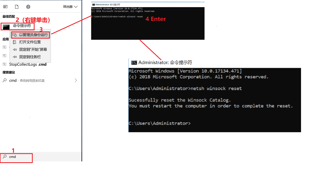 - 如果运行失败无法正常启动,可以执行 netsh winsock reset 命令进行重置网络,方法如下: