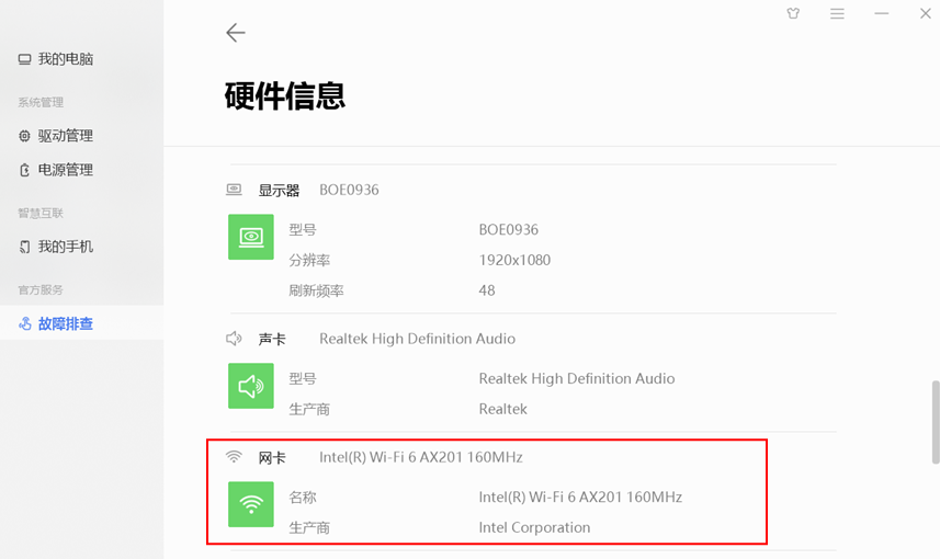 - 修复完成后,会显示出网卡或蓝牙硬件信息。