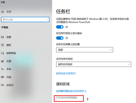 - 任务栏到通知区域,在通知区域选择“打开或关闭系统图标”。
