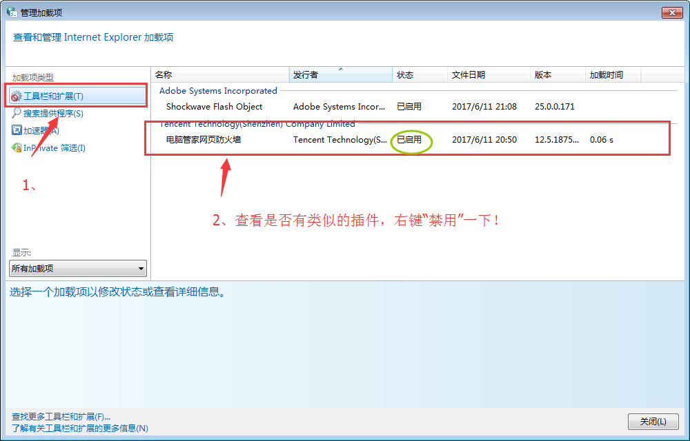 - 选择管理浏览器加载项 > 管理加载项,在工具栏和扩展查看是否有异常插件。