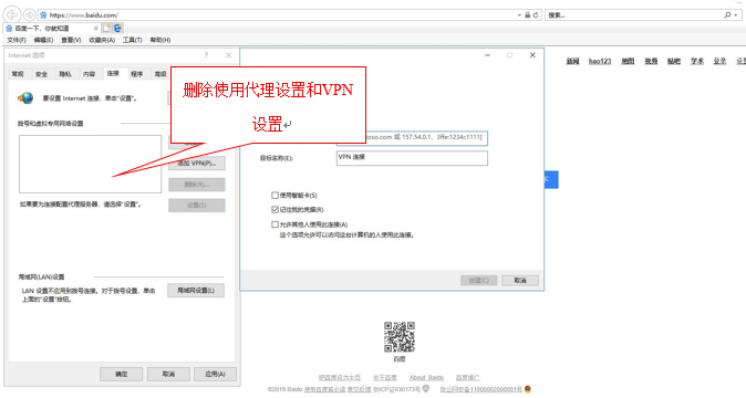 - 打开Internet Explorer>工具>Internet选项,关闭所有代理服务器设置,删除所有和虚拟专用网络的设置。