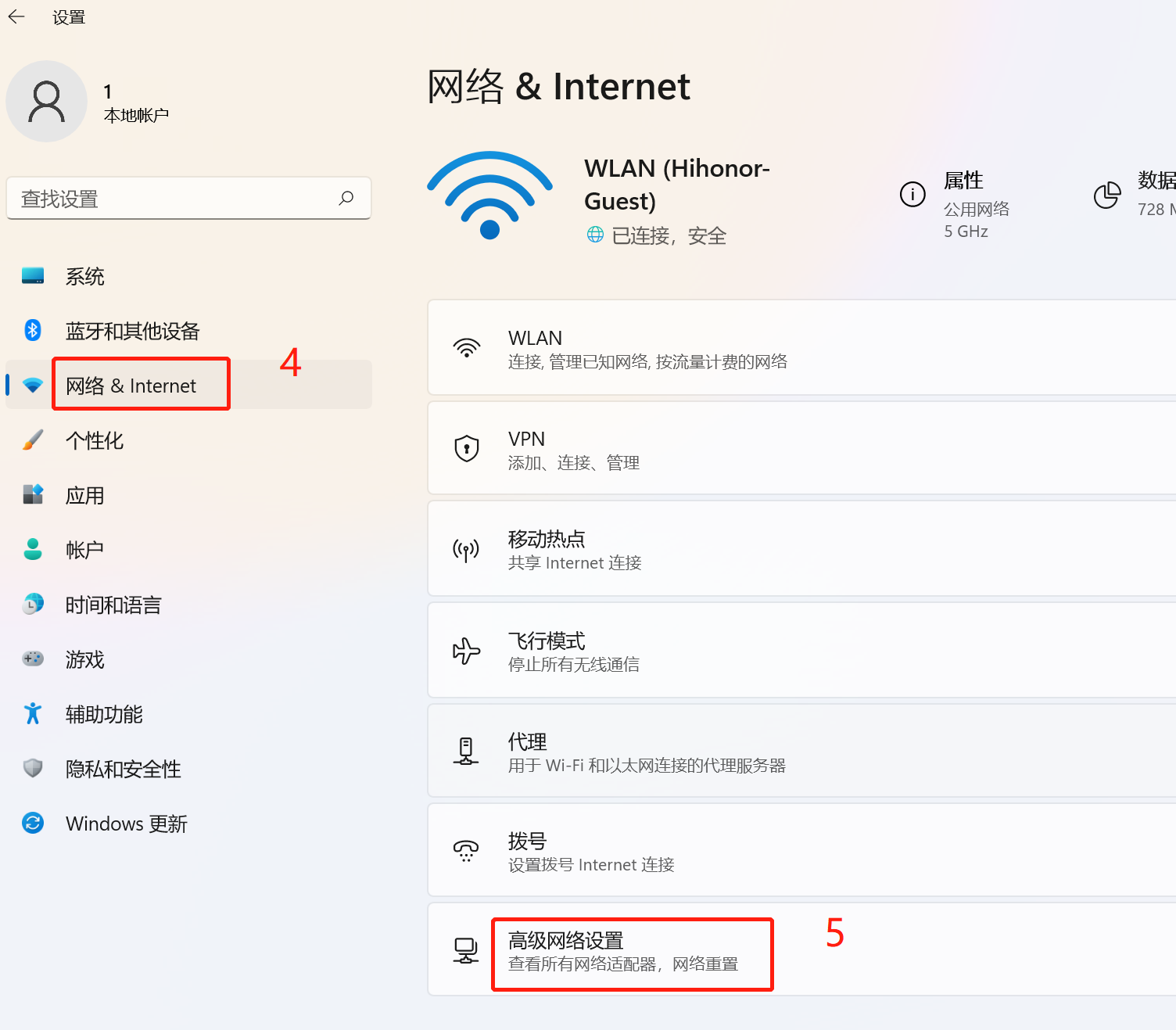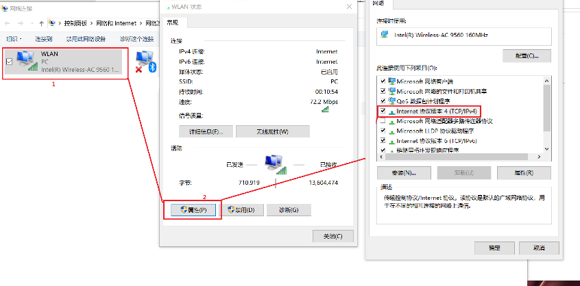 单击WLAN图标选择网络和Internet设置 > 网络和共享中心 > 更改适配器设置”> 选择WLAN>右键属性 > 选择属性 >选择IPv4修改成自动即可。