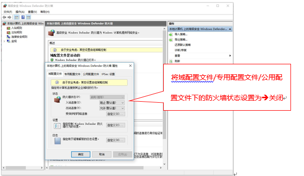 - 打开控制面板>系统和安全>Windows Defender 防火墙>点击高级设置>高级安全Windows defender防火墙设置>点击属性>将域配置文件/专用配置文件/公用配置文件下的防火墙状态设置为>关闭。