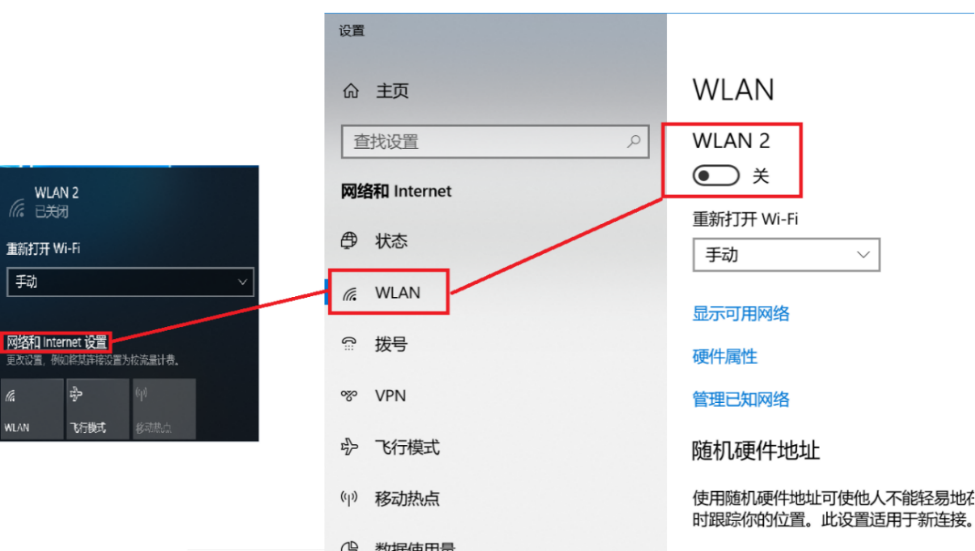 单击WLAN图标选择网络和Internet设置>网络和共享中心>更改适配器设置, 右键WLAN图标禁用然后再启用即可。