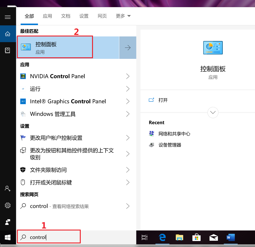 - 在计算机左下角搜索框输入control后状态栏会出现控制面板,选择控制面板。