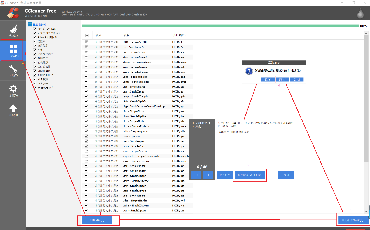 - 通过USB共享网络,下载一款杀毒软件或者在软件管家搜索CCleaner,也可以尝试使用杀毒软件直接进行清理注册表重启,如果没有恢复再下载安装CCleaner。CCleaner的官网链接为:https://www.ccleaner.com/ccleaner,安装CCleaner后选择注册表 > 扫描问题 > 清理 > 重启计算机。