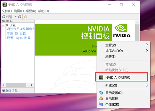 进入NVIDIA控制面板。此时桌面右击菜单列表中出现NVIDIA控制面板入口,桌面右下角NVIDIA设置图标也可点击进入NVIDIA控制面板。