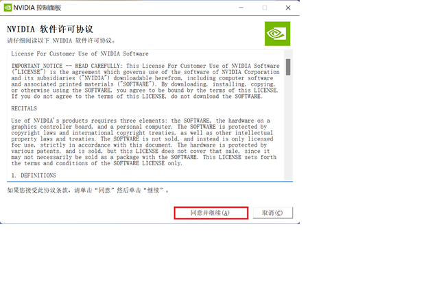 第一次点击进入NVIDIA控制面板,需选择同意并继续;