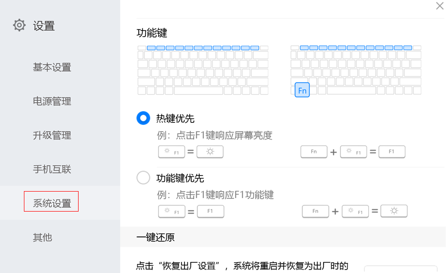 当您将它设置为功能键优先模式时,按 F10 将无法实现快捷打开电脑管家的操作,请您打开荣耀电脑管家 > 设置中心 > 系统设置 > 功能键,将功能键设置为热键优先。