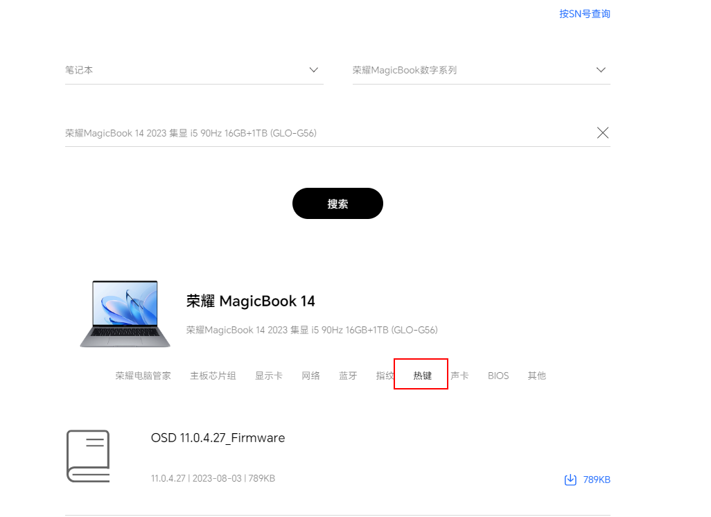 如果无法找到OSD Service 服务,请前往荣耀官网,输入产品名称并搜索,在产品驱动列表中下载安装热键程序。