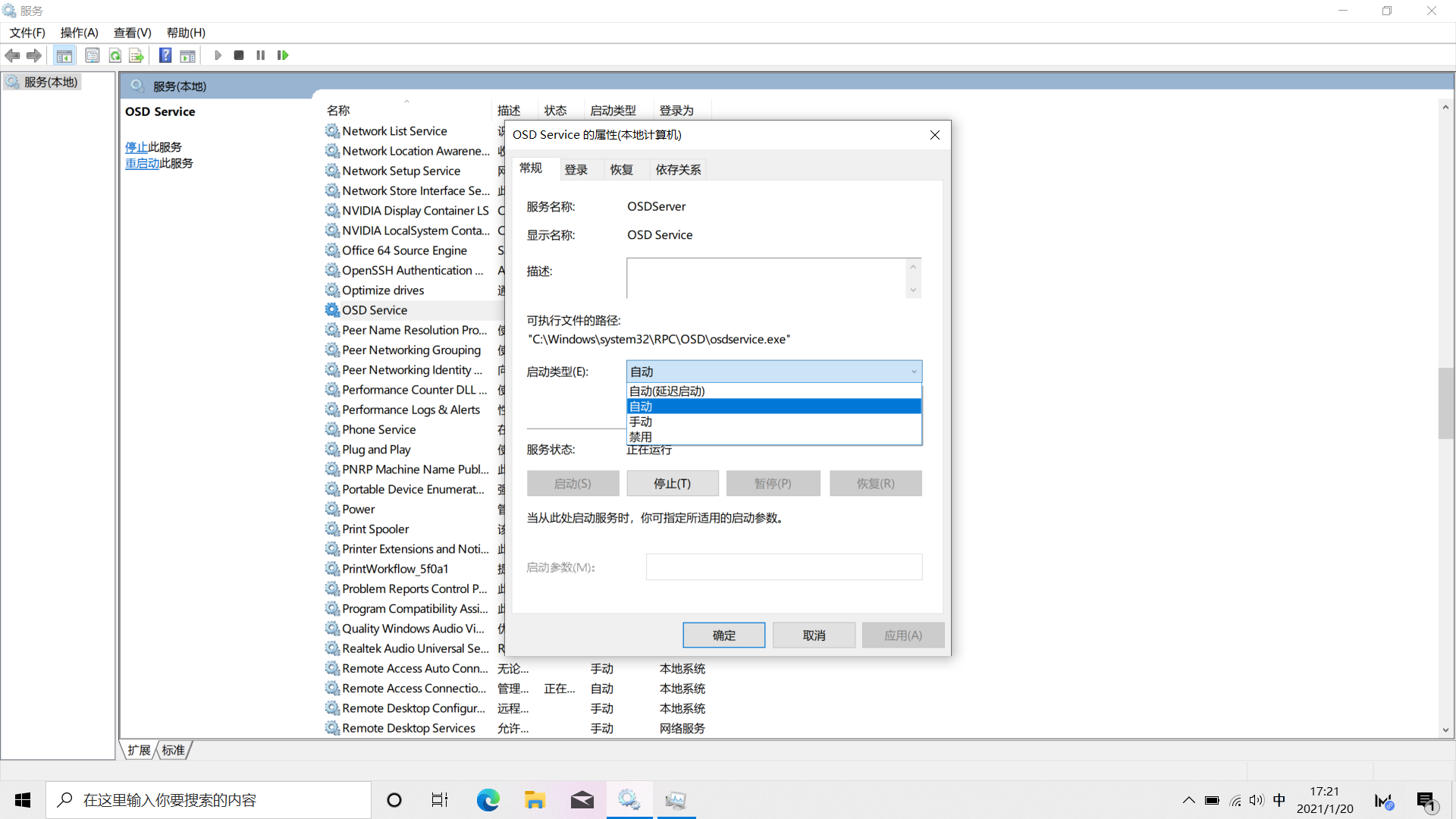 - 在任务栏搜索框输入服务,在弹出的服务列表中,找到 OSD Service,双击将其设置为自动启动。