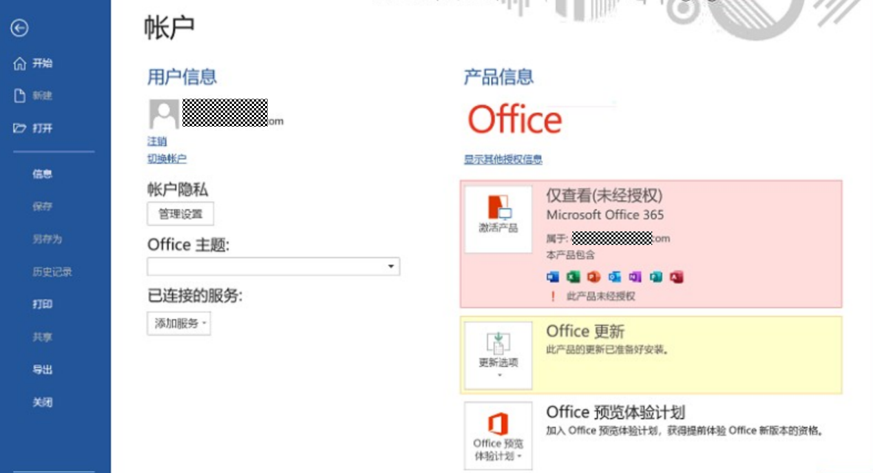 | 打开Office应用组件查看产品信息的激活状态,显示“仅查看(未经授权)”现象 |