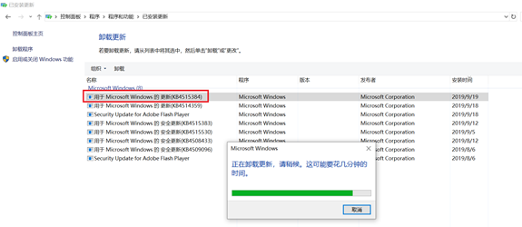 - 选中KB4515384或KB4512578右键点击“卸载”选项,等待卸载完成后,按提示点击“立即重启此计算机”。