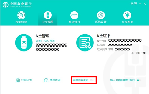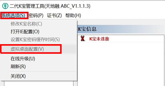 - 在“K宝管理”页面,关闭“启用虚拟桌面”选项。