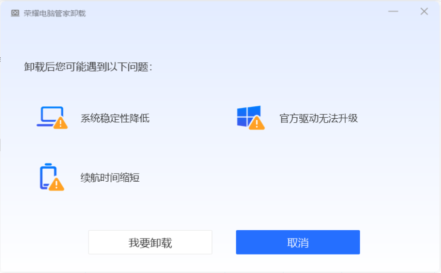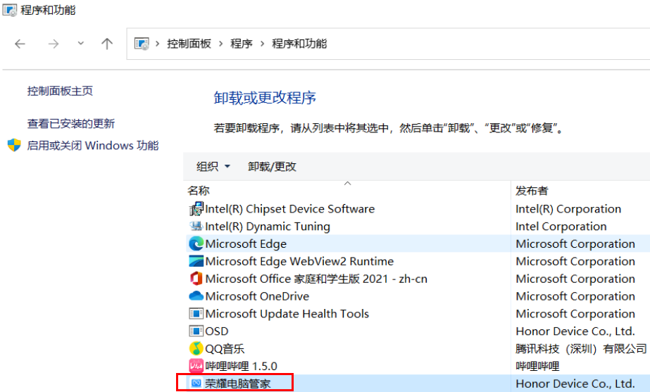 - 进入控制面板>卸载程序>荣耀电脑管家,右键点击卸载/更改,选择后点击我要卸载。
