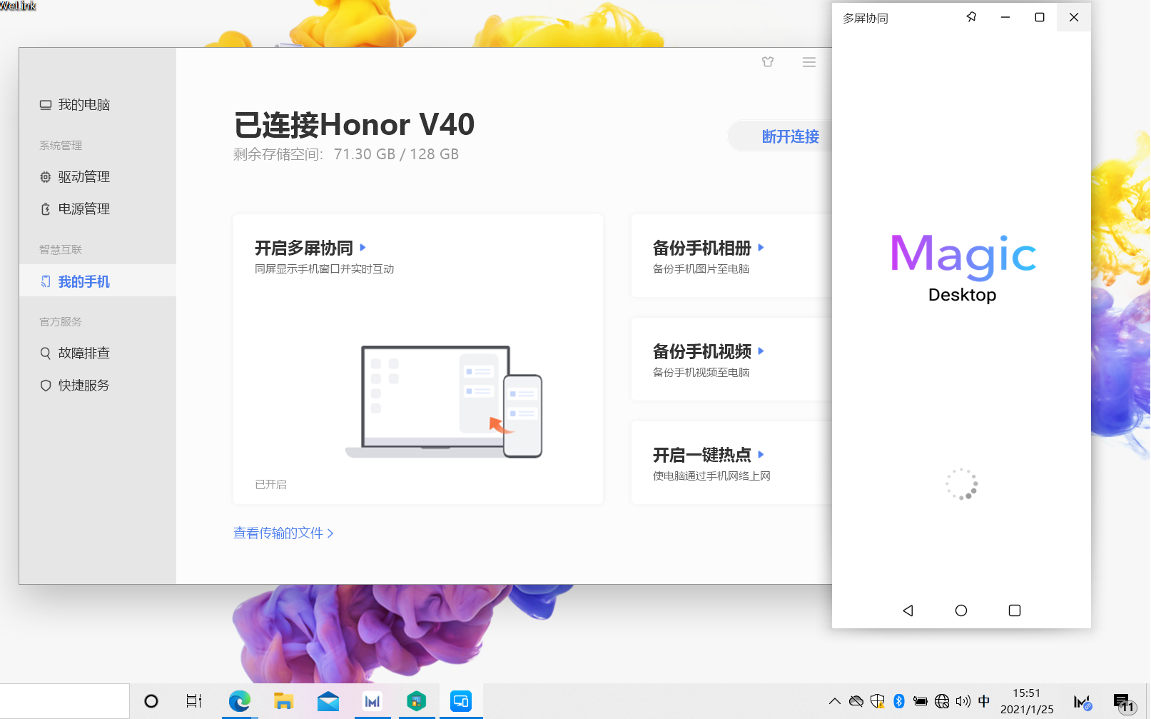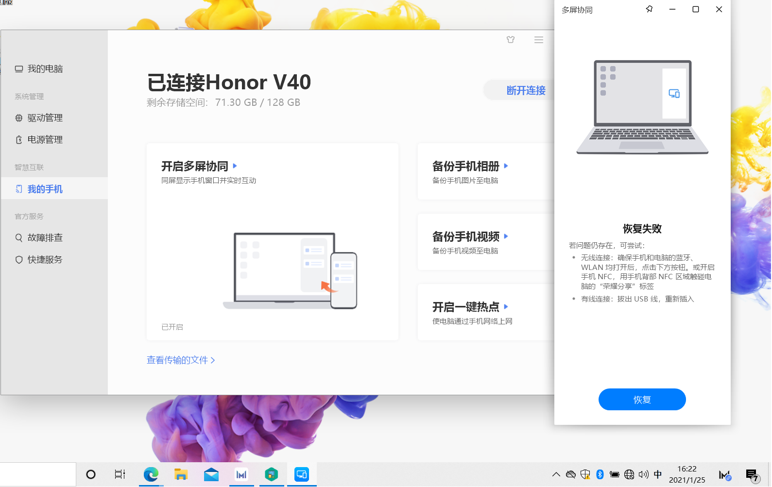 多屏协同与手机连接后,多屏协同手机虚拟窗口一直加载转圈,几秒钟后提示“连接异常”。