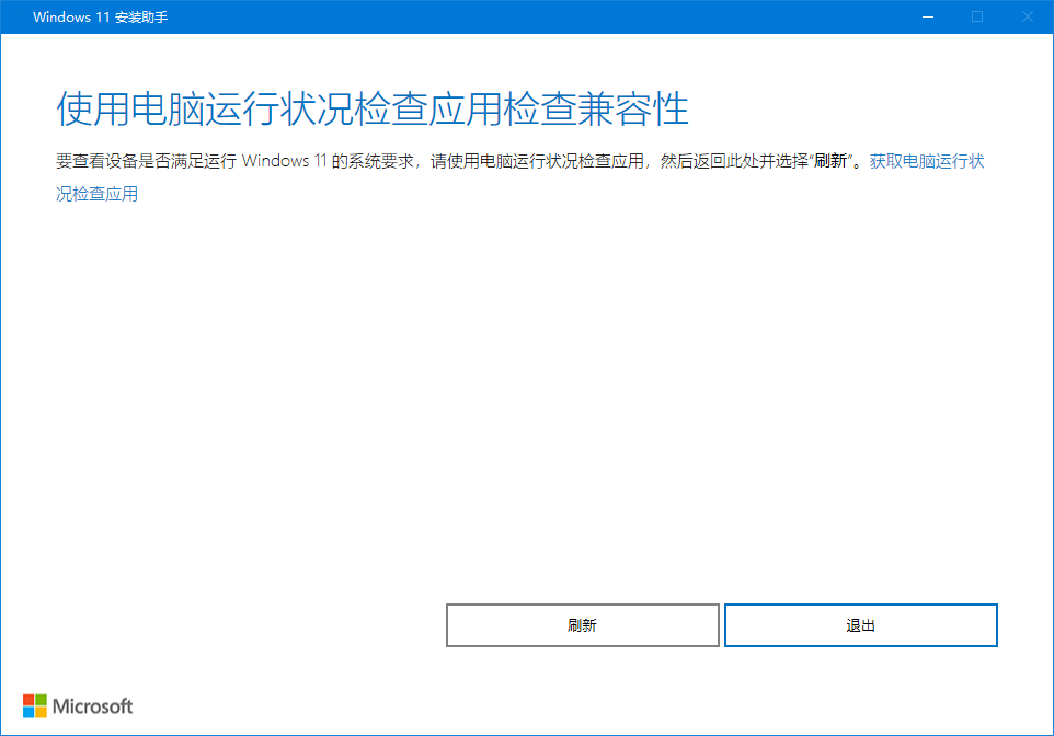 - 如果出现提示“使用电脑运行状况检查应用检查兼容性”,请按照提示,先获取电脑运行状况检查应用。或访问https://aka.ms/GetPCHealthCheckApp 下载电脑健康状况检查。如果没有出现该提示,请直接进入第5步。