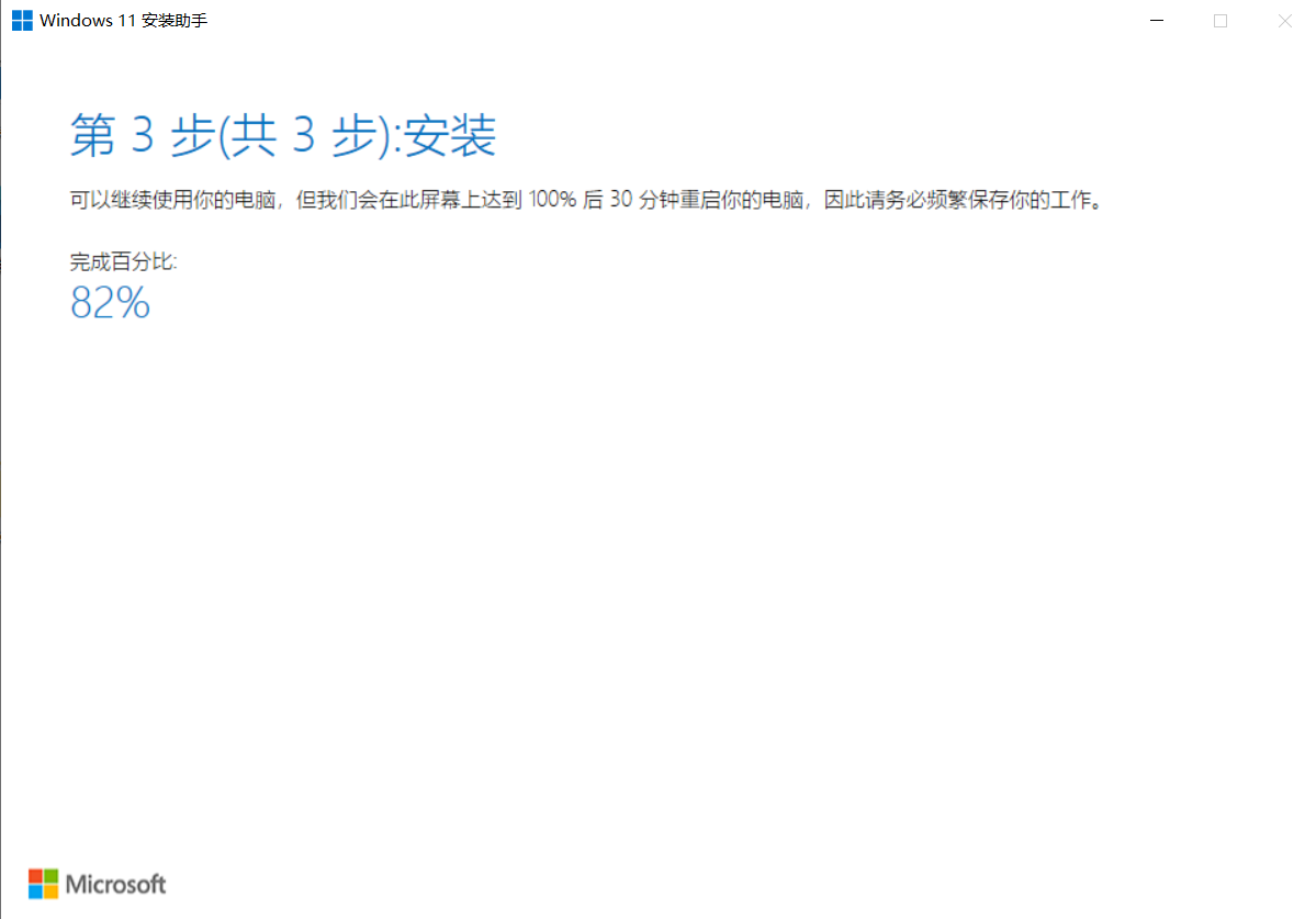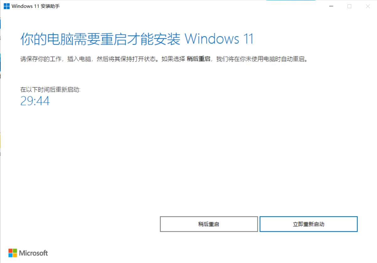 - 下载完成之后如下图,点击立即重新启动完成Windows11安装。