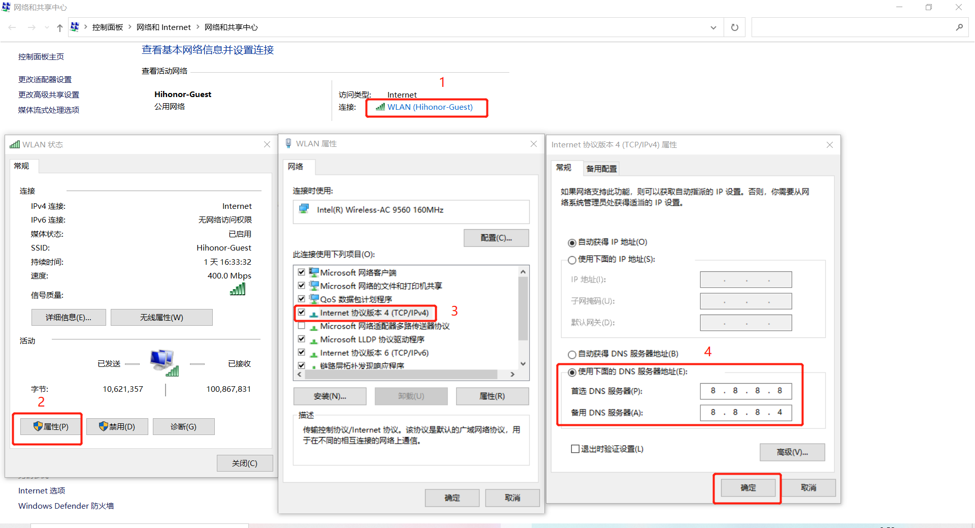- 点击现在连接的网络名称,打开网络状态窗口,点击属性,在网络属性窗口中双击 Internet 协议版本4 (TCP / IPv4)。