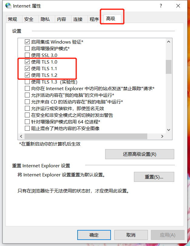 - 任务栏搜索框输入Internet,打开Internet选项>高级,勾选使用TLS1.0,使用TLS1.1,使用TLS1.2三个选项,点击确定。
