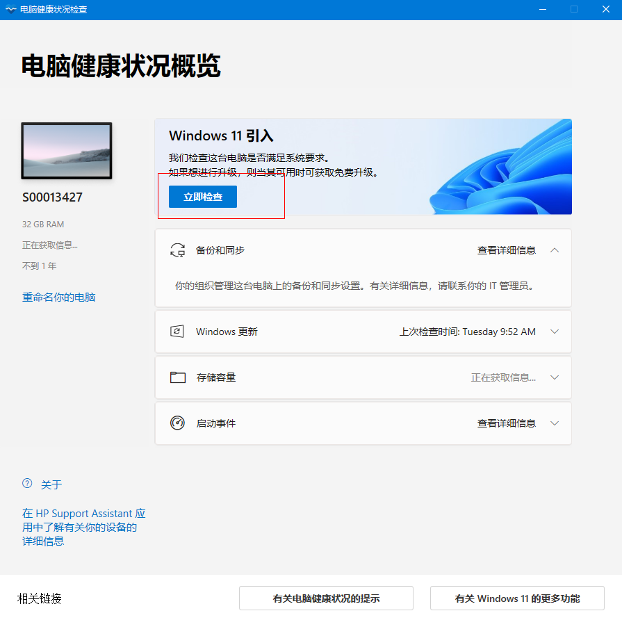 - 如果出现提示“使用电脑运行状况检查应用检查兼容性”,请按照提示,先获取电脑运行状况检查应用。或访问https://aka.ms/GetPCHealthCheckApp 下载电脑健康状况检查。如果没有出现该提示,请直接进入第5步。