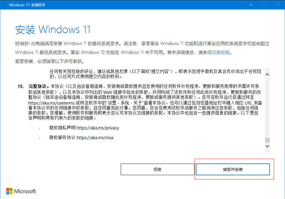 - 检查结束后,返回Windows 11安装助手界面,点击下方刷新按钮,稍后即可进入安装 Windows 11界面,点击“接受并安装”。