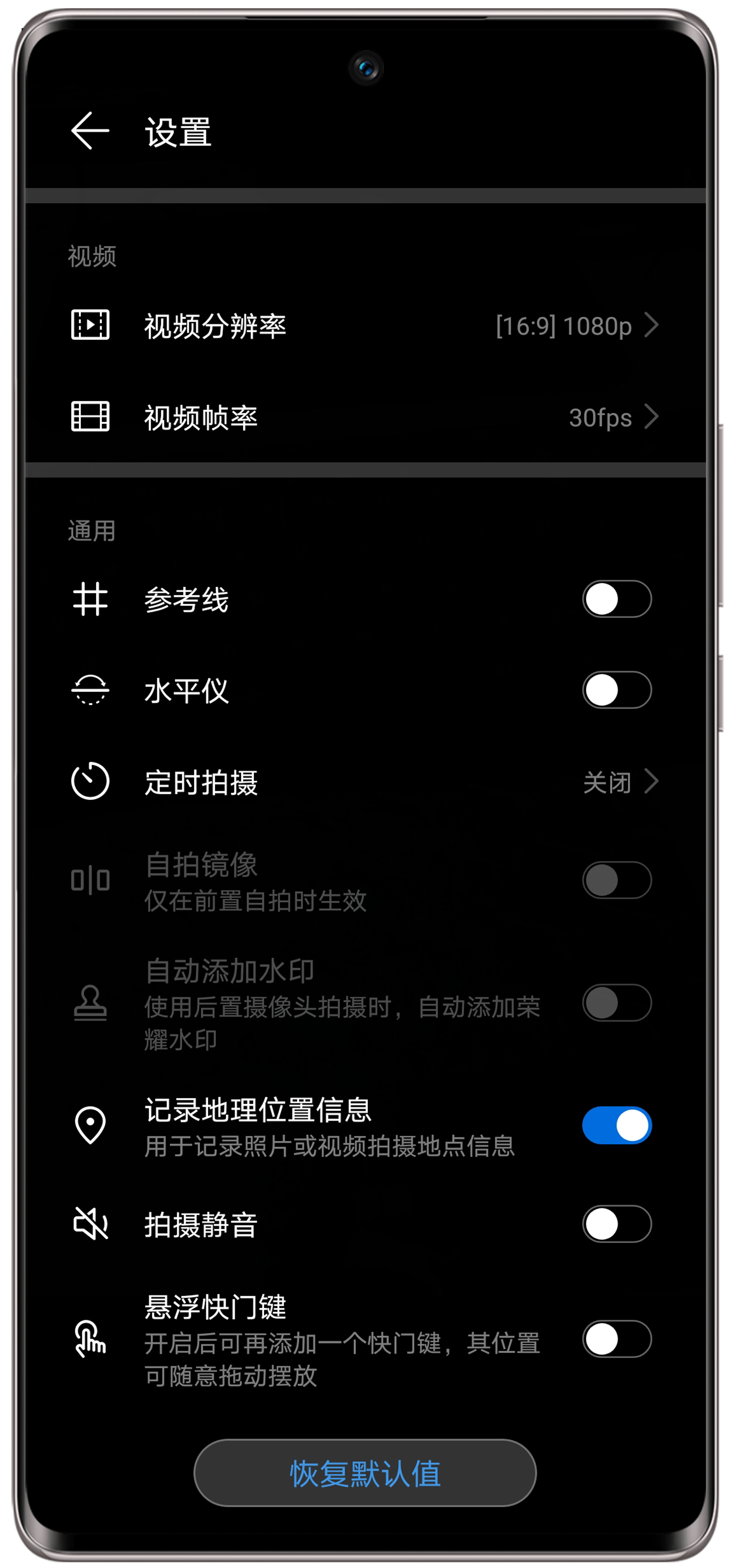 - 建议您使用原相机的默认参数录制视频。录像效果不好或卡顿可以点击相机界面右上角的设置图标,在设置界面最底部,点击恢复默认值后重试。
