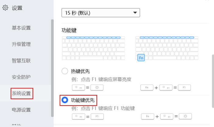设置中心 -> 系统设置,在功能键里,选择功能键优先。