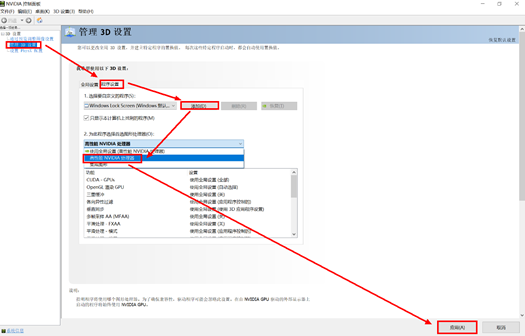 - 点击“管理 3D 设置 > 程序设置”,点击“添加”,添加需要优先使用独立显卡的程序,然后选择“高性能 NVIDIA 处理器”,点击“应用”。